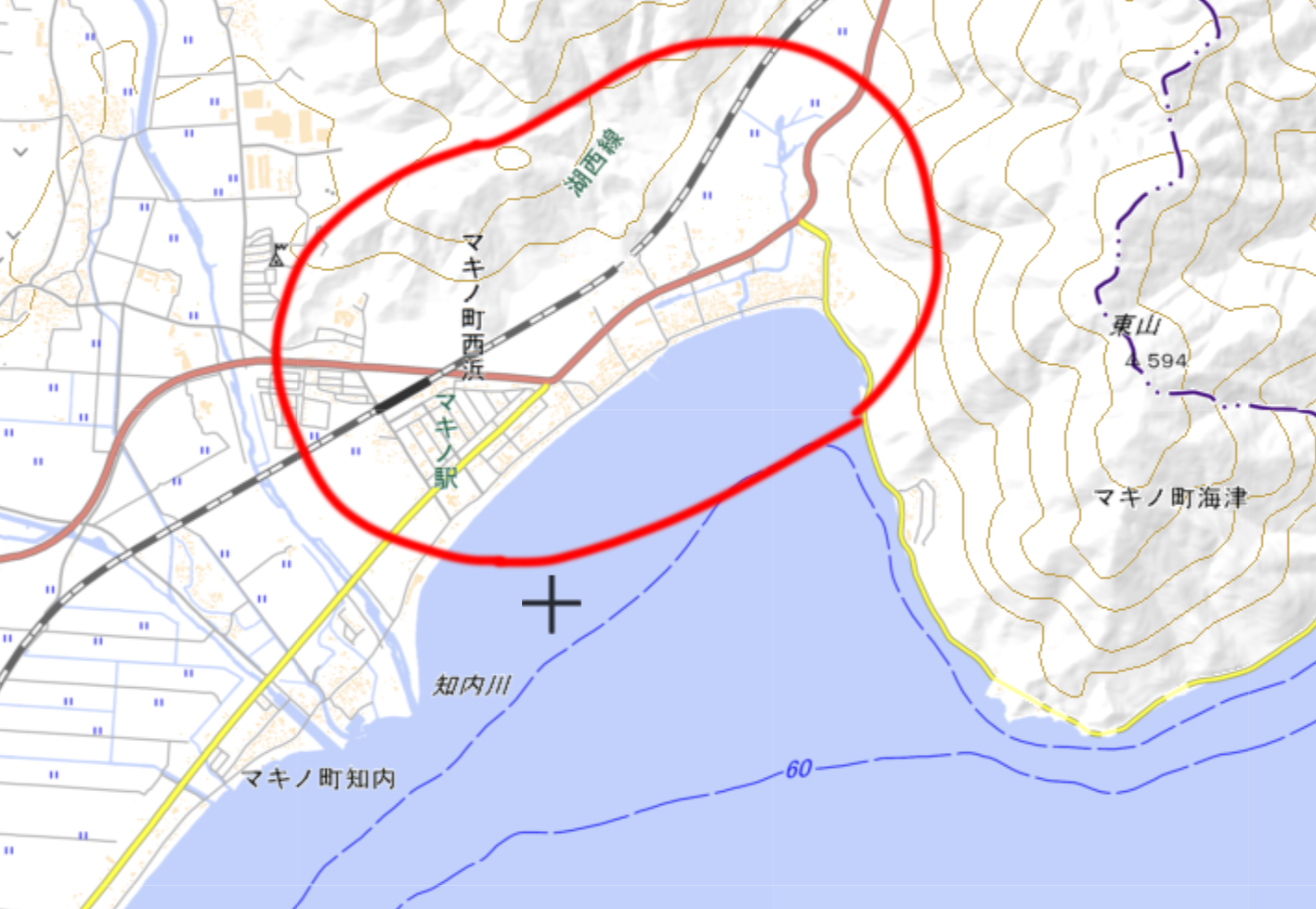 海津地域は地図でいうと下記の赤く囲ったあたりの、びわ湖の一番上に近い地域です。