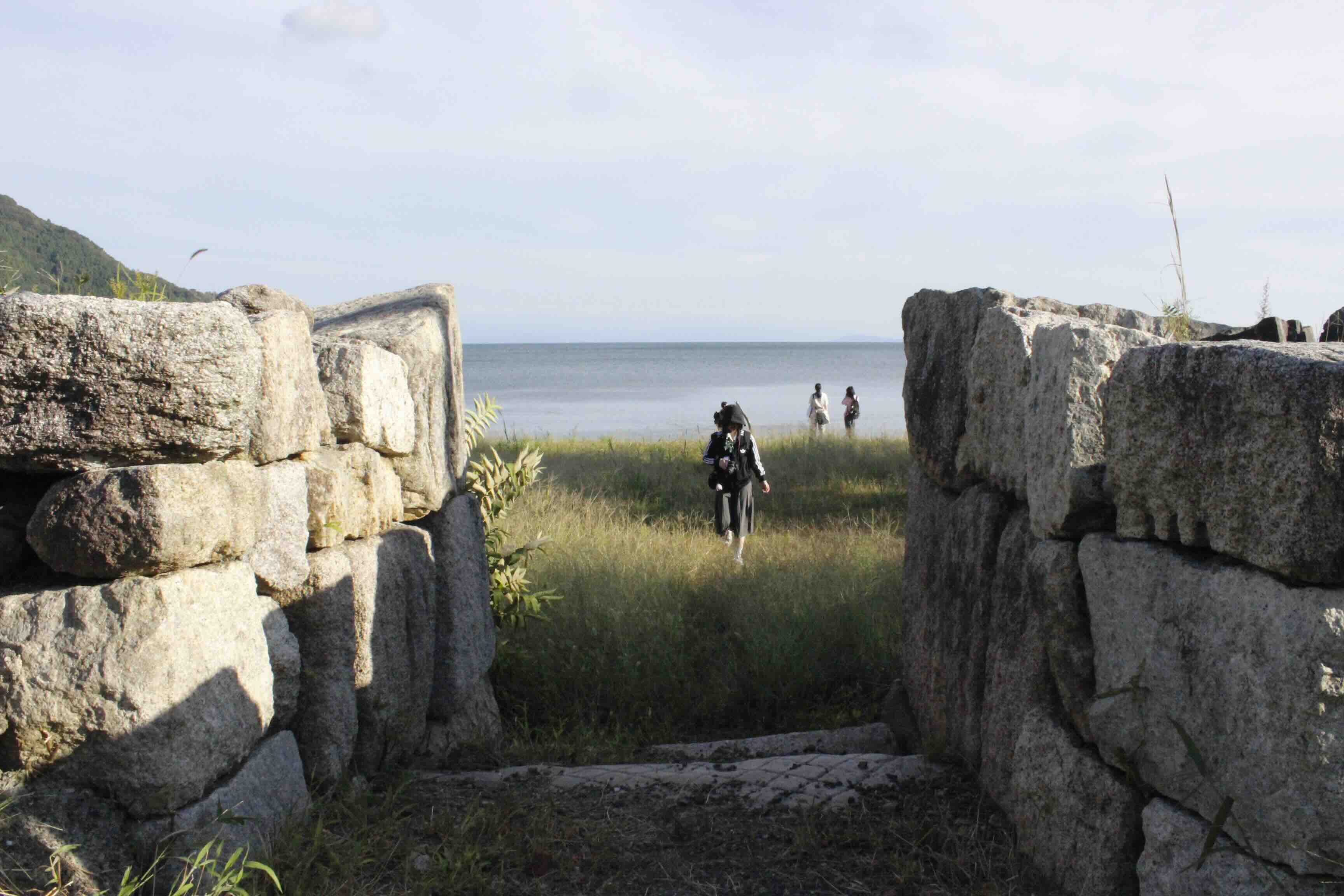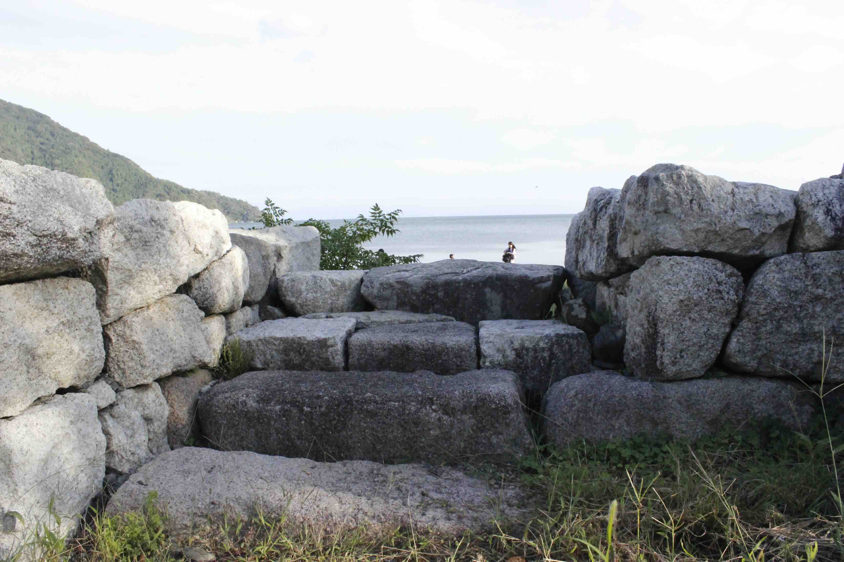 ▲この写真は道路の方からびわ湖を撮った写真ですが、左右の石の壁が特徴的だと思いませんか?