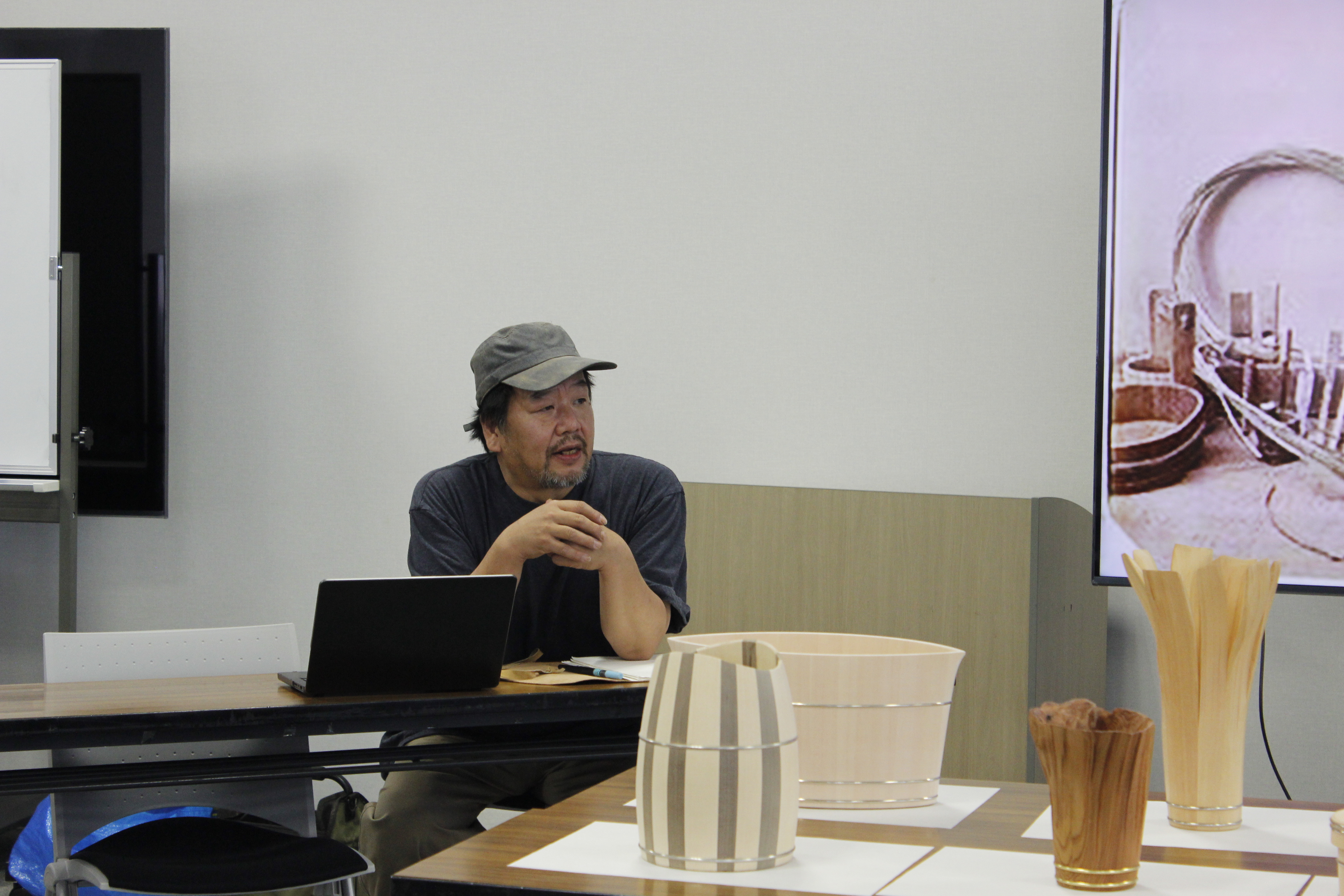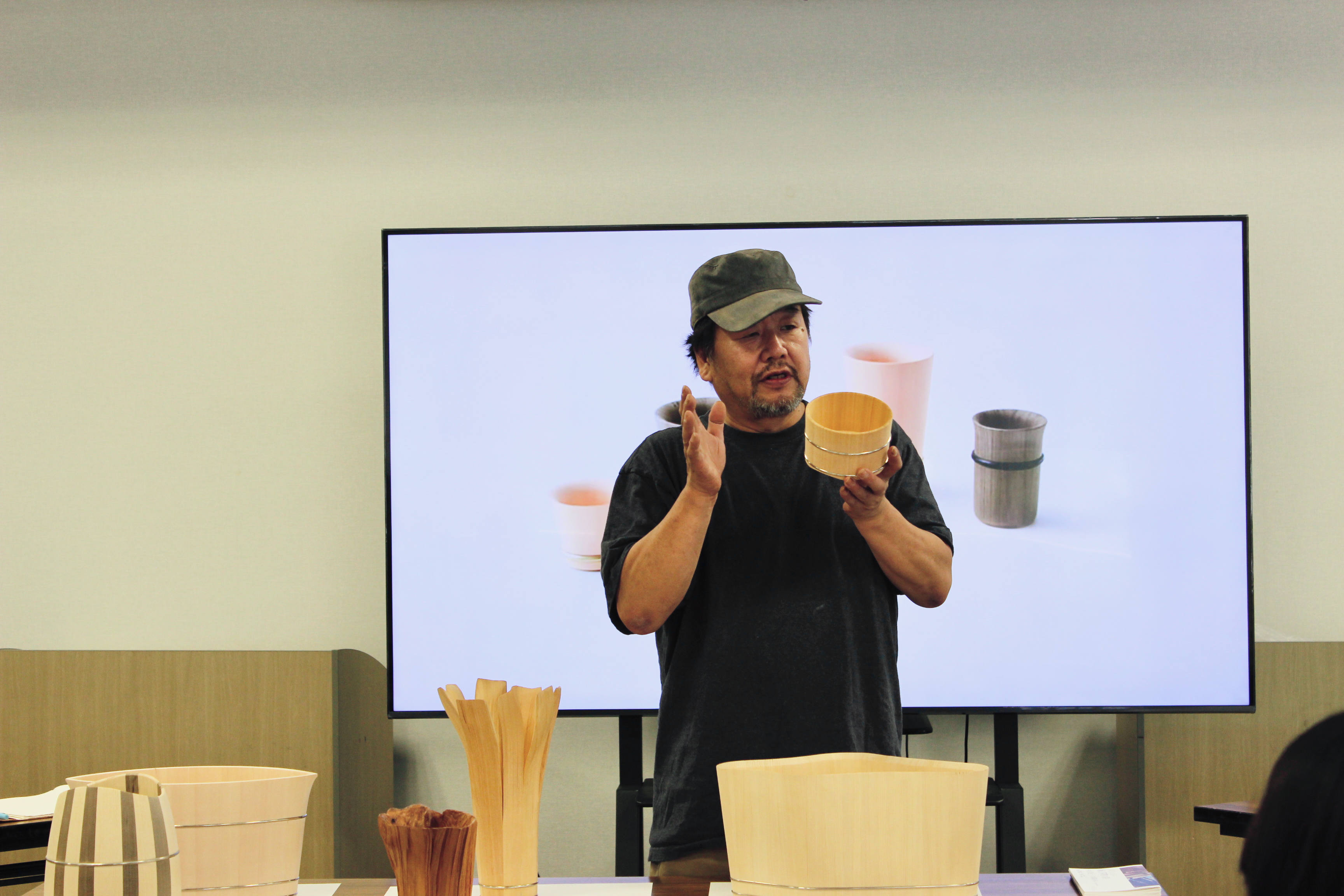 中川木工芸の歴史や桶が作られる工程をまず教えていただき、その後は、桶の可能性を展開した、デザイナーや現代美術作家とコラボレーション作品や展示の紹介がありました。